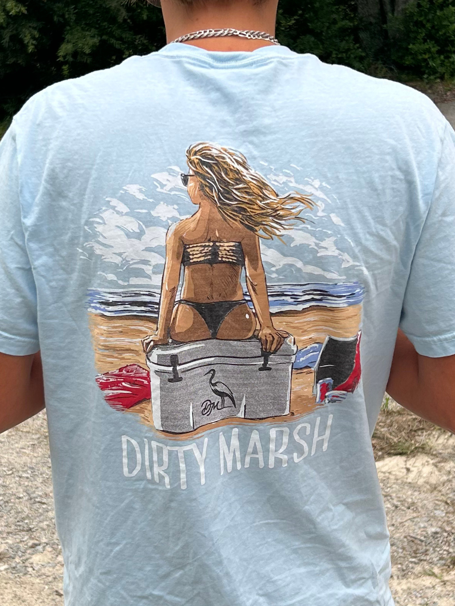 Sun on your shoulders, toes in the sand, cooler packed with bad decisions — that’s the spirit this shirt was made for. Featuring a Dirty Marsh spin on a beach scene that’ll get more double takes than Marshall pulling up in the Cateye, this design is equal parts cheeky and unapologetically southern.